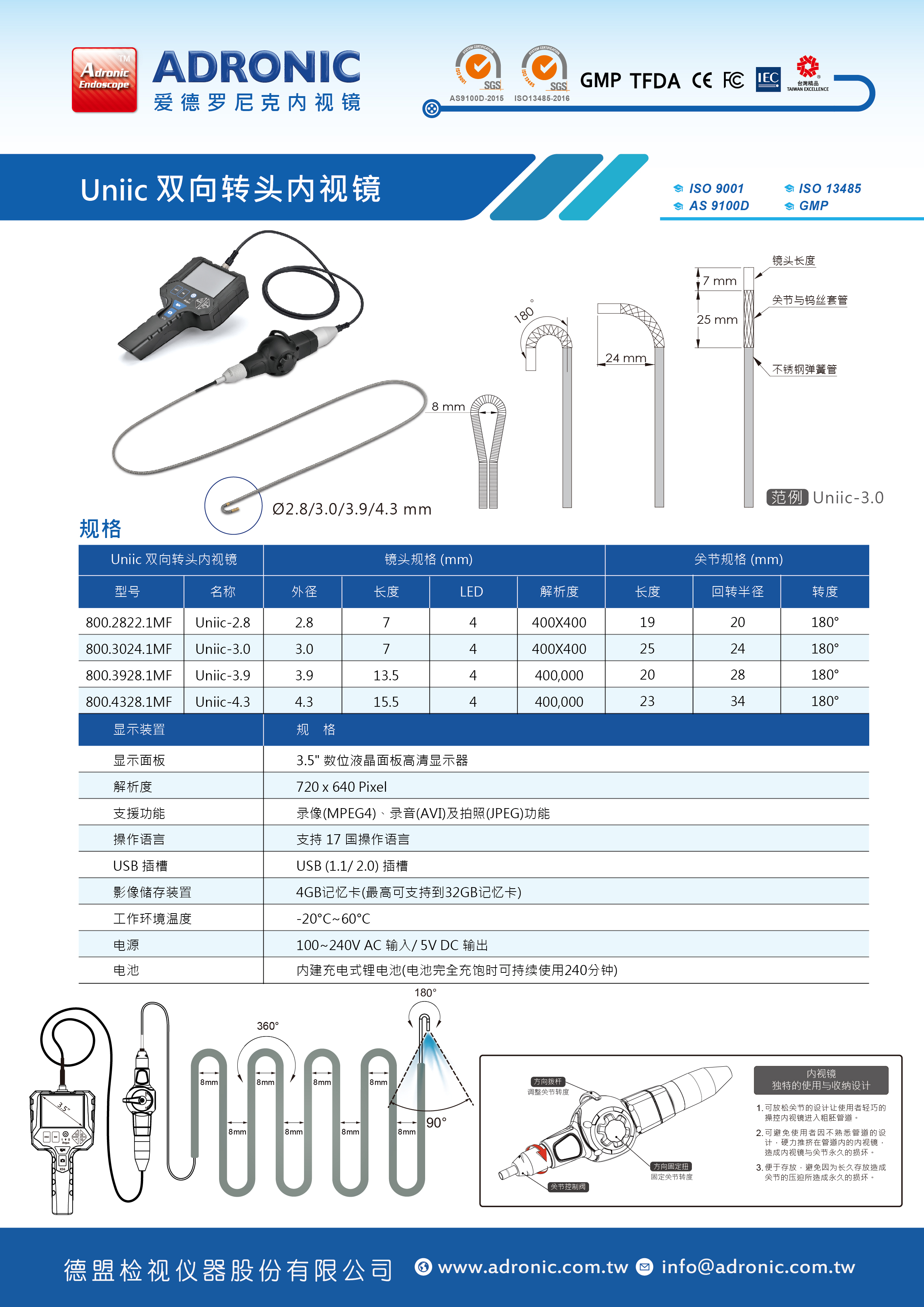 Uniic双向转头内视镜 | 镜头规格(mm) | 关节规格(mm) | |||||||