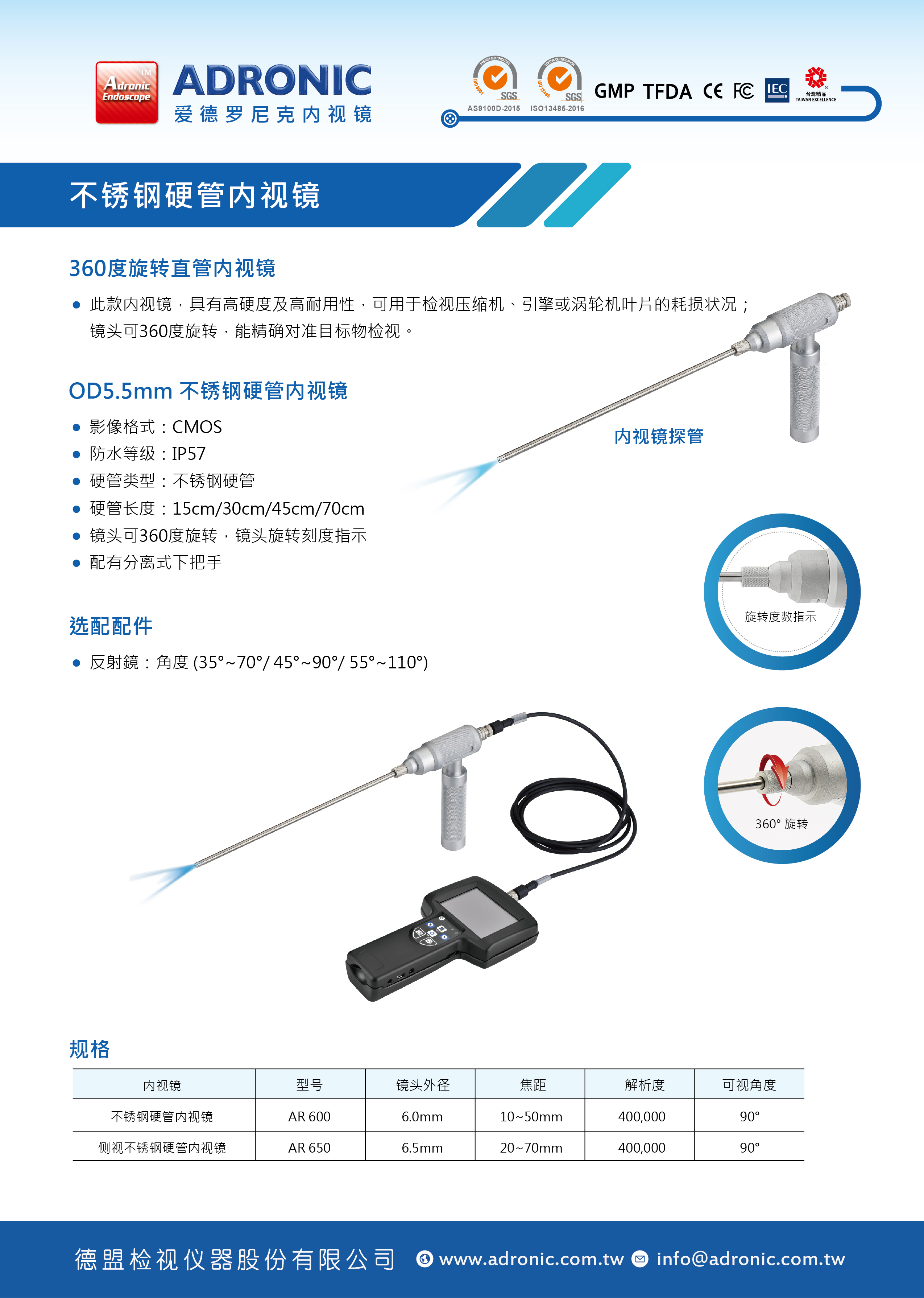 Adronic 360° 旋转直管内视镜能支援360°旋转,它有利于使用者检查周围的禁区。我们的360度旋转控制器旋转钮的特点是明确的角度引导线,使用者可以知道镜头的旋转角度。