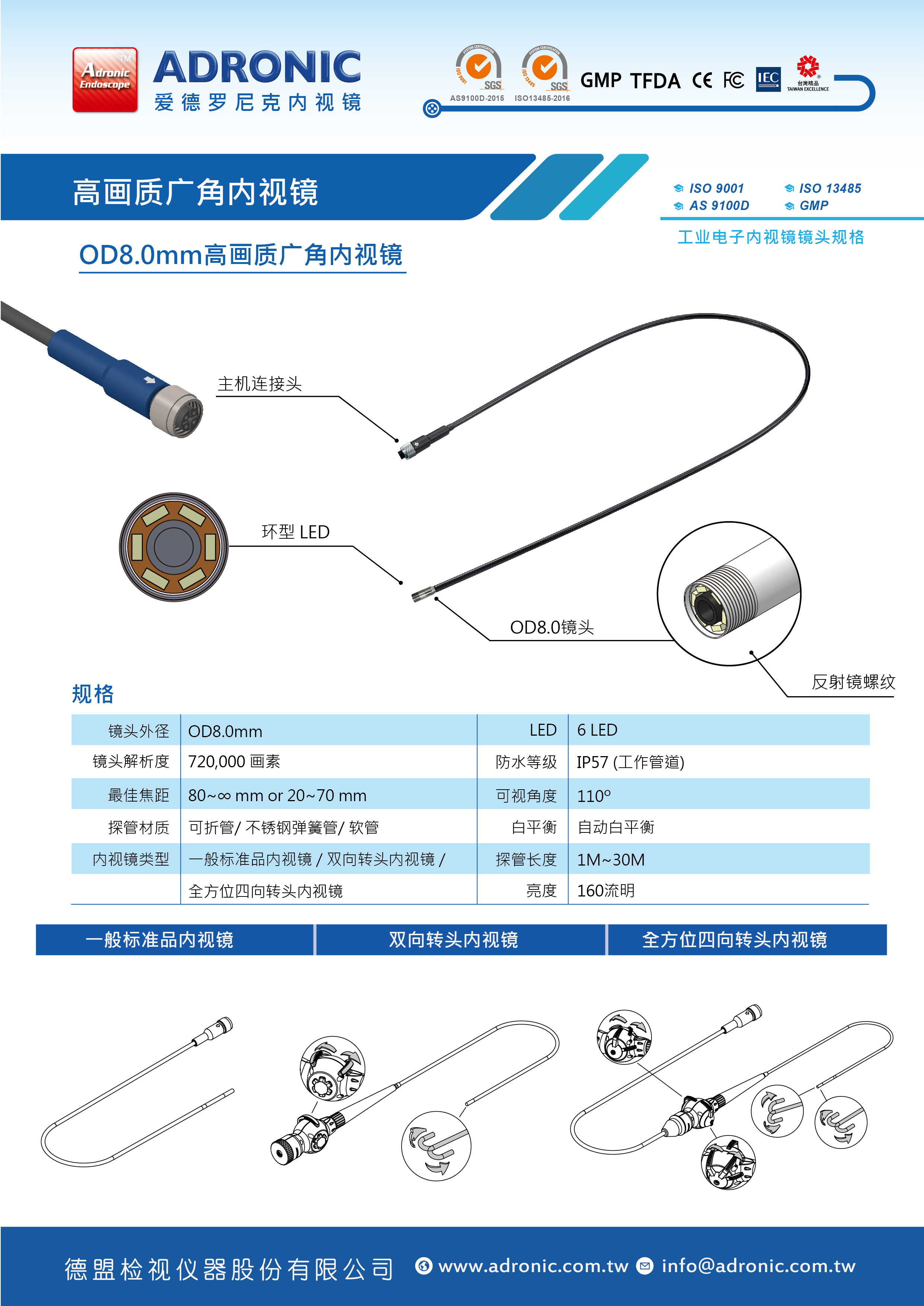 一般标准品内视镜、双向转头内视镜、全方位 / 四向转头内视镜