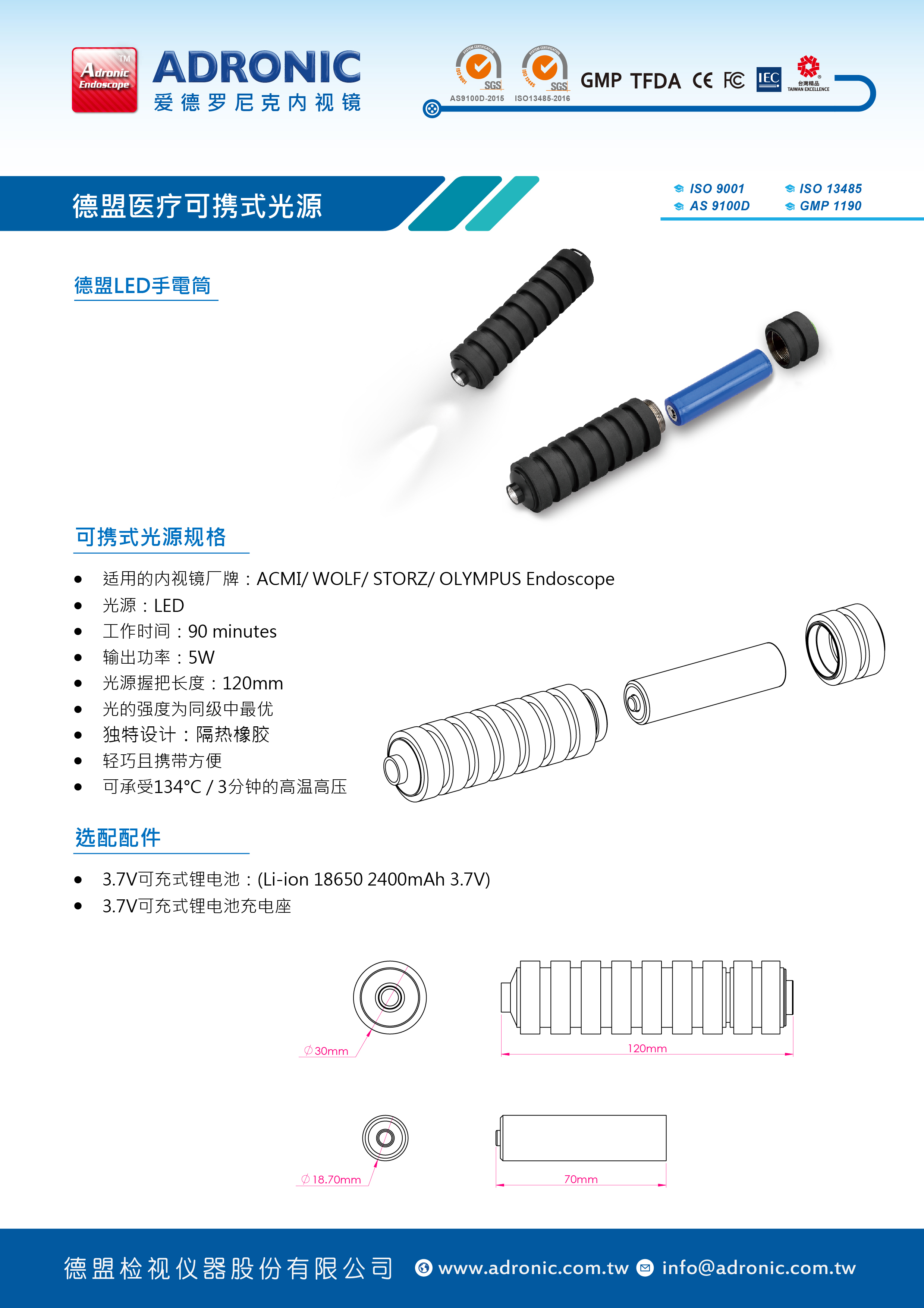德盟LED手电筒:可携式光源供应强大的LED照明,独特的机构设计能让热源保留在内部,以避免高温传输至光源外部,使的使用者在长时间的诊断过程中更为舒适,此装置利用锂电池供应电源,依不同的使用状况可维持50至85分钟,且轻巧的外型,更能使消费者方便携带及使用