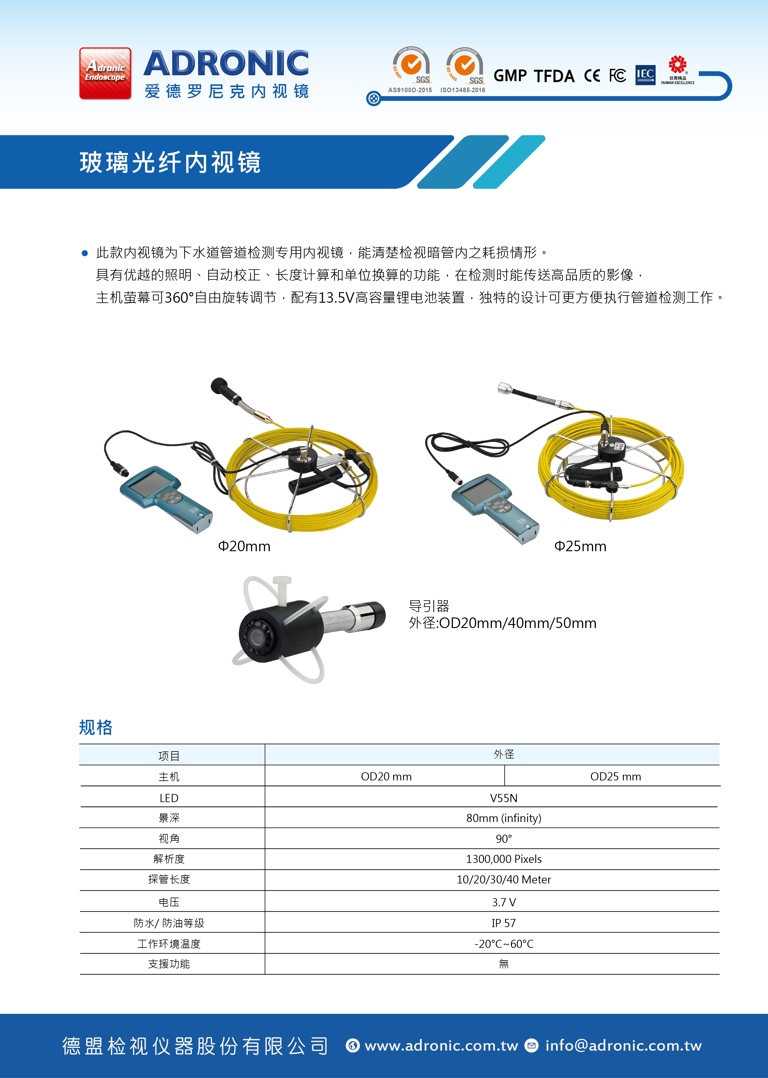 此款内视镜为下水道管道检测专用内视镜,能清楚检视暗管内之耗损情形。具有优越的照明、自动校正、长度计算和单位换算的功能,在检测时能传送高品质的影像,主机萤幕可360°自由旋转调节,配有13.5V高容量锂电池装置,独特的设计可更方便执行管道检测工作。